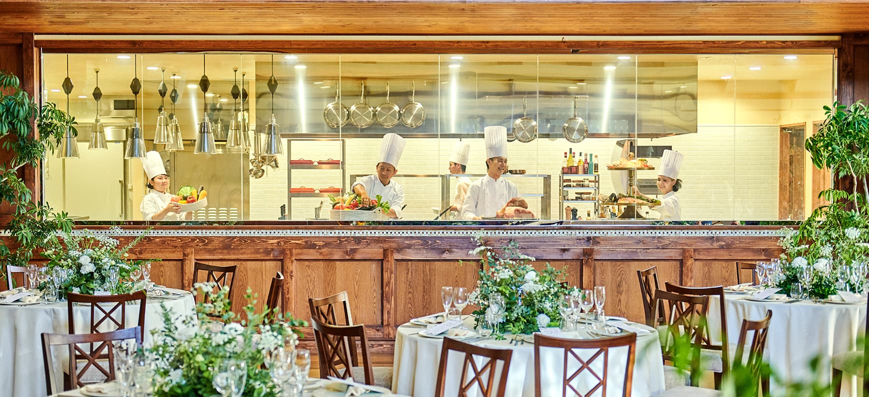 お客様の様子やパーティの進行具合を確認できる会場併設のオープンキッチンからは、