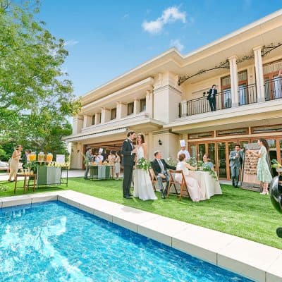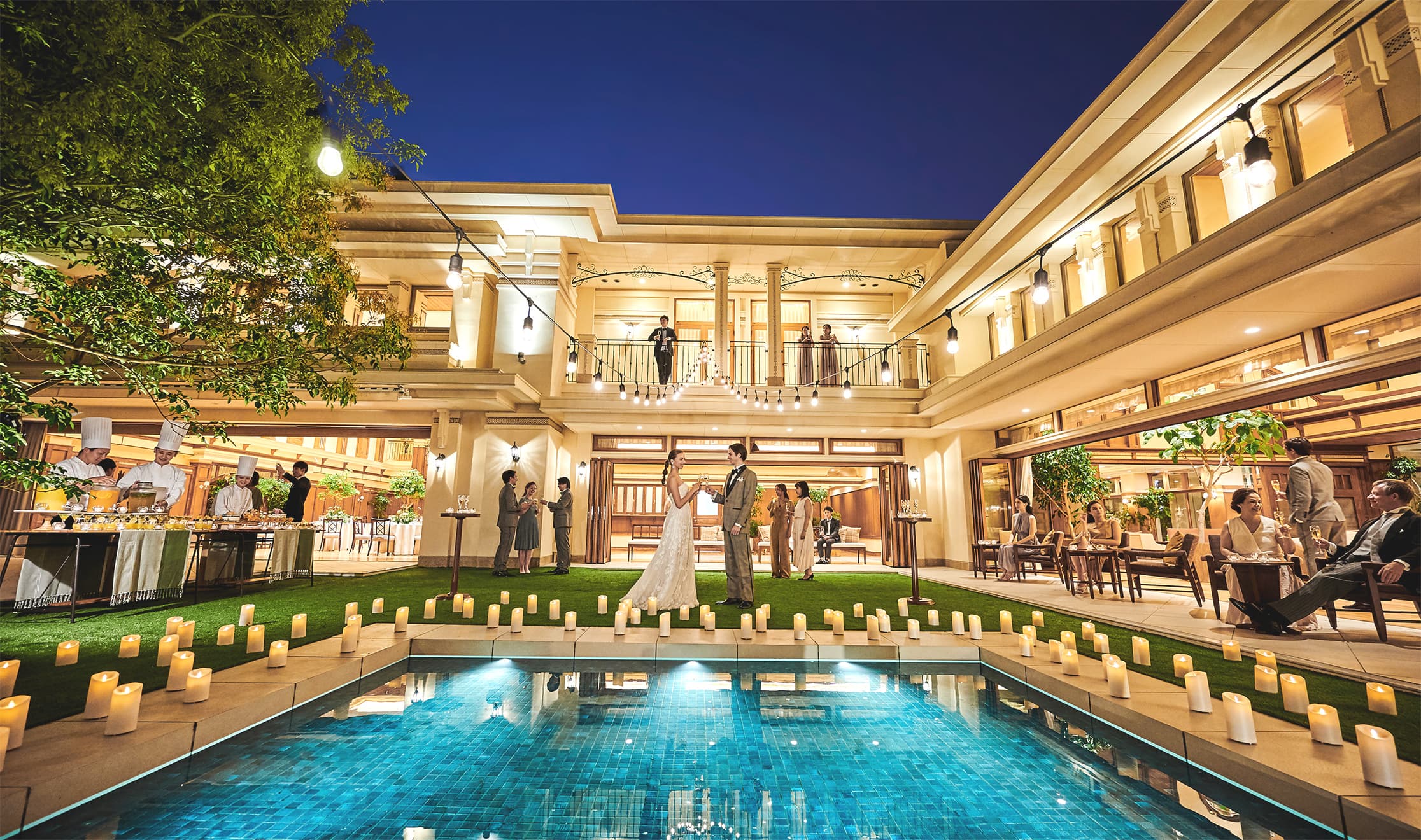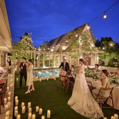 プールサイドにはいくつものキャンドルが並び、水面に幻想的な輝きを放ちます。邸宅全体がきらびやかに彩った大人の空間で、ロマンティックなパーティをお楽しみいただけます。