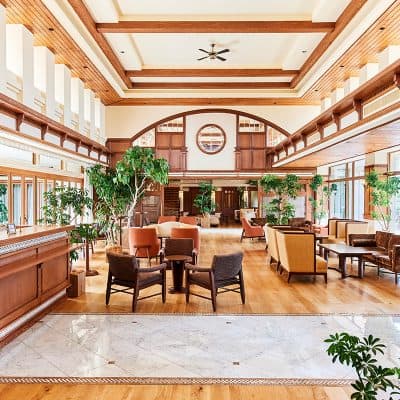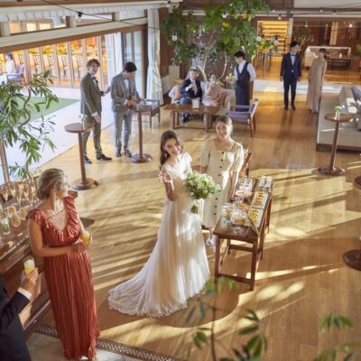 ゲストを最初にお迎えするラウンジは、リゾート感あふれる自然光がたっぷりと差し込む明るい空間。バーカウンターではドリンクをご用意しウェルカムパーティの場としてもご利用いただけます。