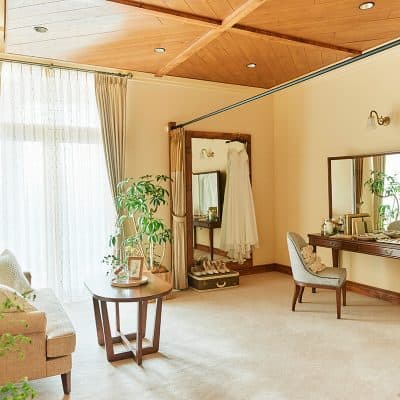 ご両家の親族専用の控室をそれぞれにご用意しています。緊張を優しくほぐすような色合いのお部屋で、挙式までの時間をゆったりとお過ごしいただけます。
