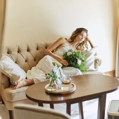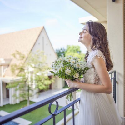 バルコニーからは、緑豊かなガーデンを見渡すことができる開放的なブライズルームはまるでスイートルーム。パーティ後の時間は、こちらでおふたりでゆっくりとお食事をお楽しみいただきながら、お寛ぎいただけます。