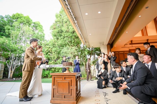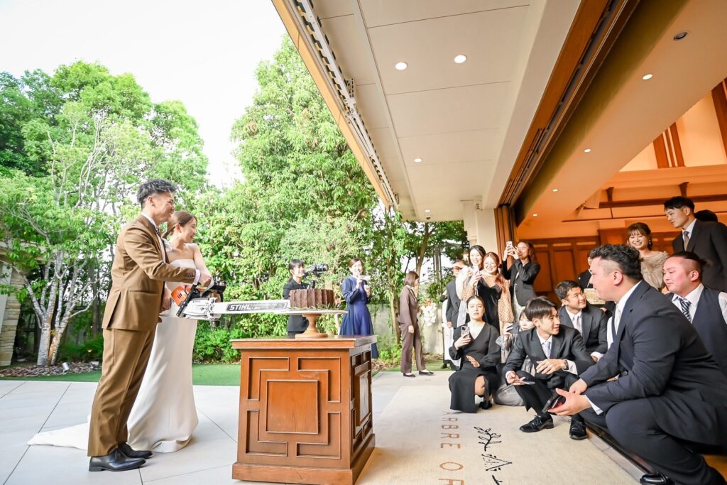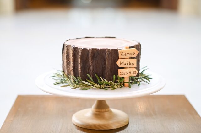 こだわったところは、新婦実家の愛犬にリングドッグをやってもらったことです。リハーサルは完璧だったけど、本番は全然違う方へ行ってしまったのもいい思い出です♡また、ケーキセレモニーでは、新郎の職業が林業なので、切り株をイメージしたウェディングケーキにしてもらい、ケーキ入刀はナイフではなく、チェーンソーでやったところもこだわりポイントです!犬用のケーキも用意してもらい、リングドッグのお礼として、サンクスバイトも行いました!
