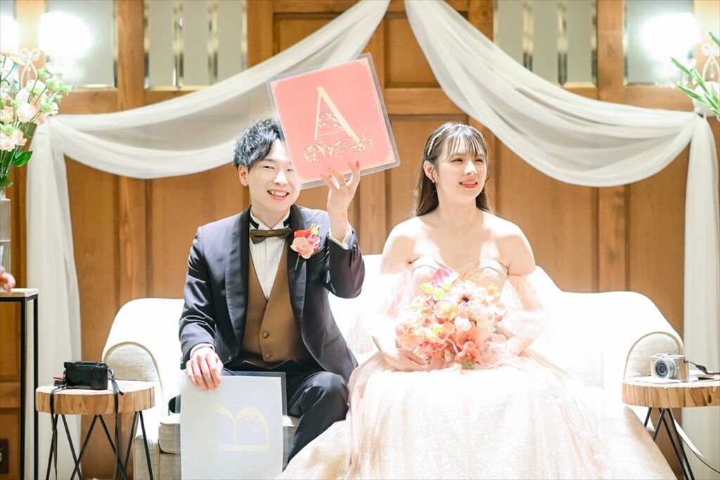 お仕事がおいそがしい中、一生懸命準備を頑張ってくださり、私のこともいつも気にかけてくださる優しいおふたり。ゲストの皆さまと過ごす時間を少しでも長くとることができるように、当日はウェディングケーキセレモニーを入れず、ご歓談タイムを優先しました!おふたりそれぞれが自由にゲストの皆さまとのご歓談、お写真タイムを過ごしていただき、おふたりらしいアットホームな一日をゲストの皆さまにも感じていただくことができたこと、とても嬉しく思います。「全員で一緒に楽しめるように」と取り入れた格付けチェックはゲストの皆さまにも大好評で、大盛り上がりとなりました♪